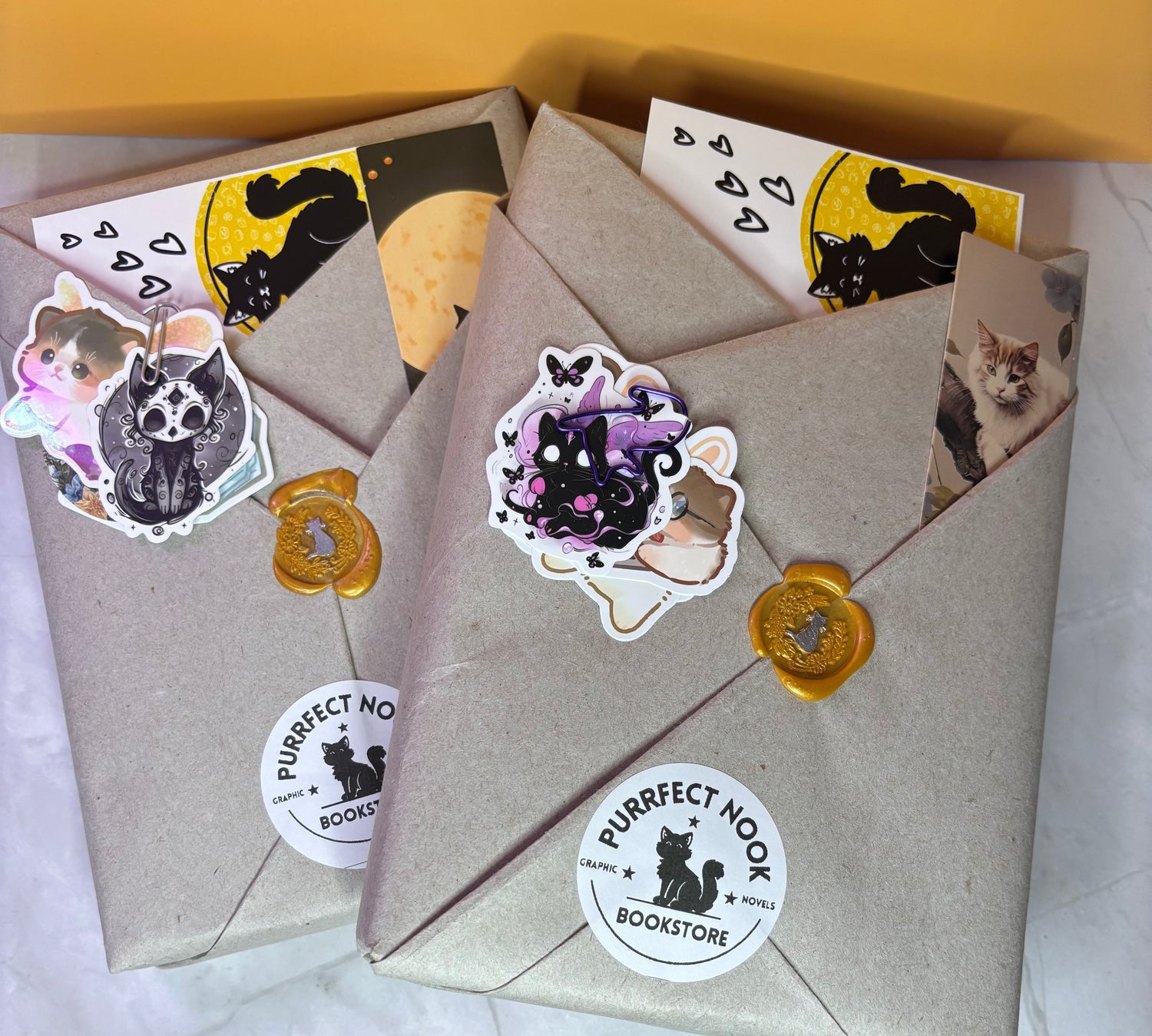 Each of our products is carefully packed with a cat themed bookmark and stickers. We're proud to offer unbeatable quality and service.